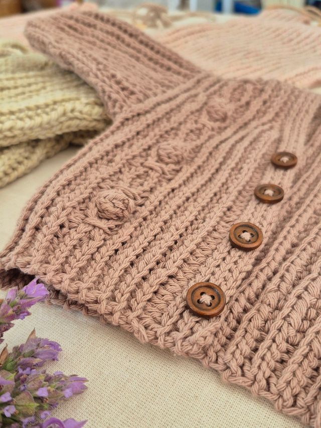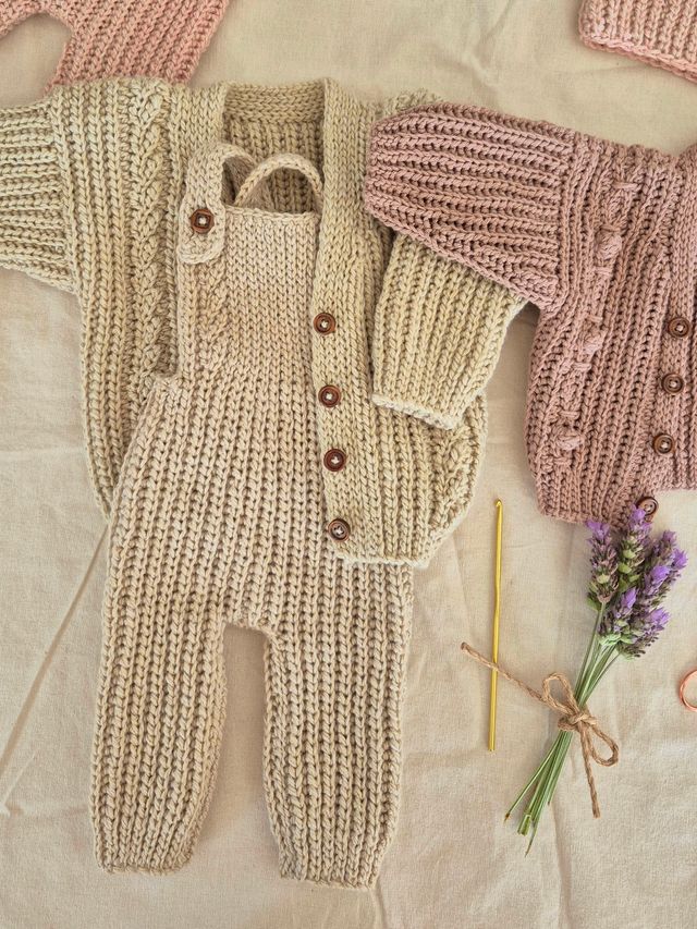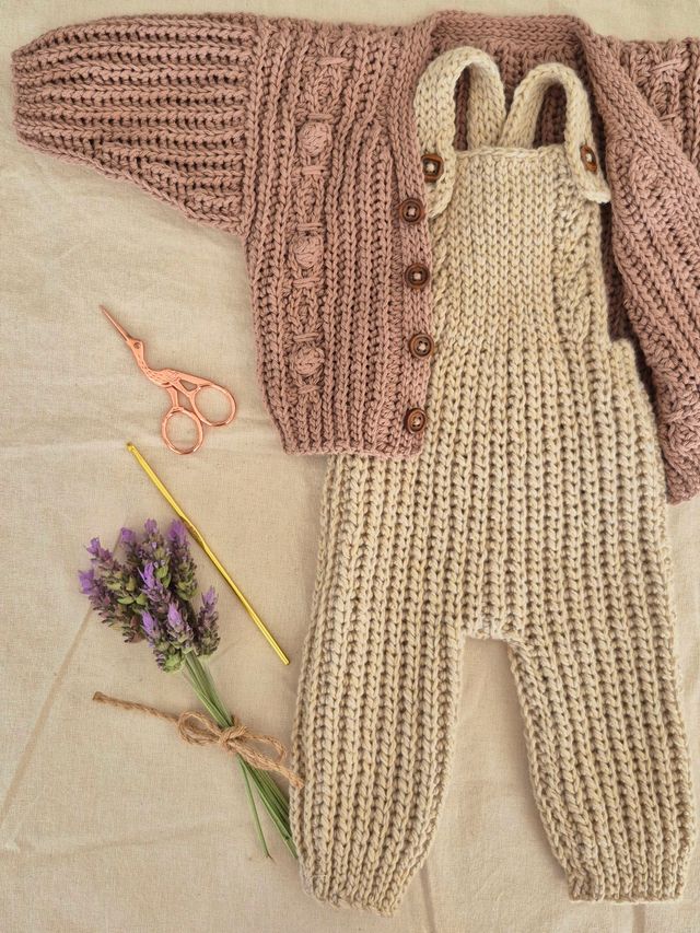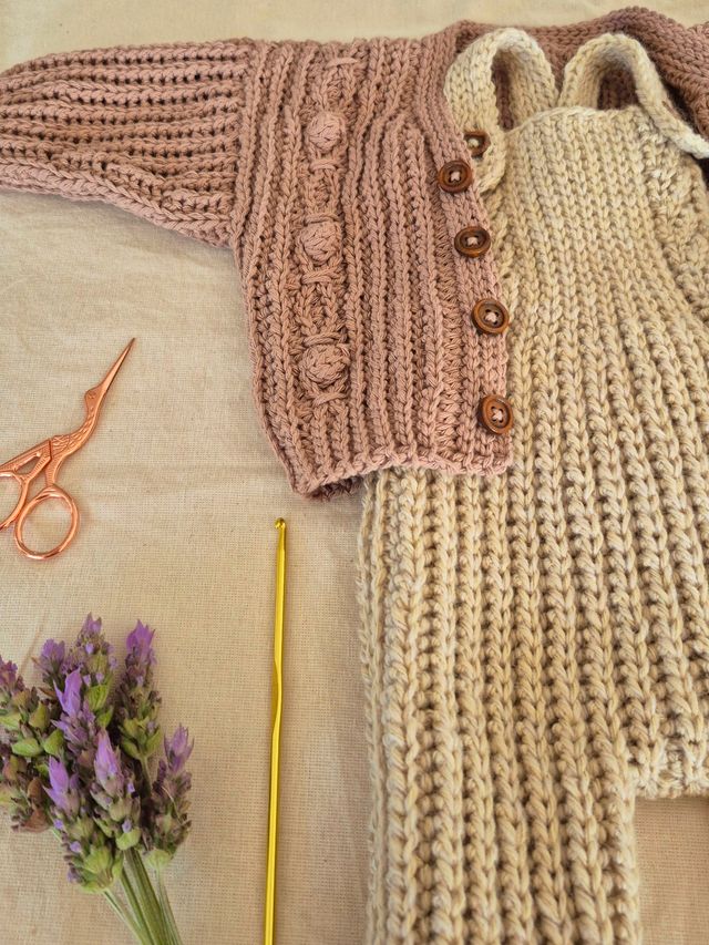 Nivel 2 de la colección de crochet en vertical para bebés. Cárdigan + jardinero con detalles en el frente y prácticamente sin costuras.